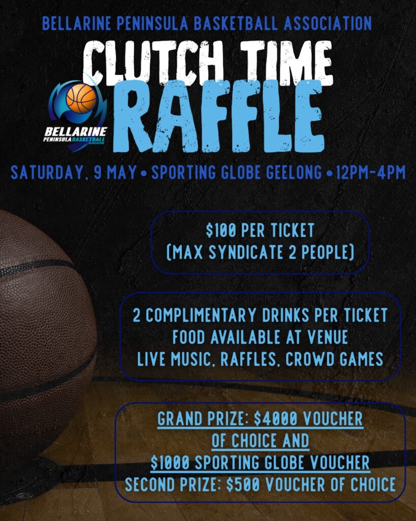Get in while you can…our Clutch Time Raffle Fundraiser is here and spots are not going to last long! We invite you to join us at Sporting Globe Geelong for music, raffles, crowd games and more while we come together to raise funds for BPBA. All event details are shown in the graphic above.